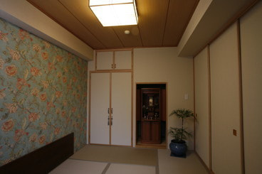 押入れを小さくし、押入れだった一部を仏間にしました。また、アクセントで壁紙を一部柄の壁紙にしました。